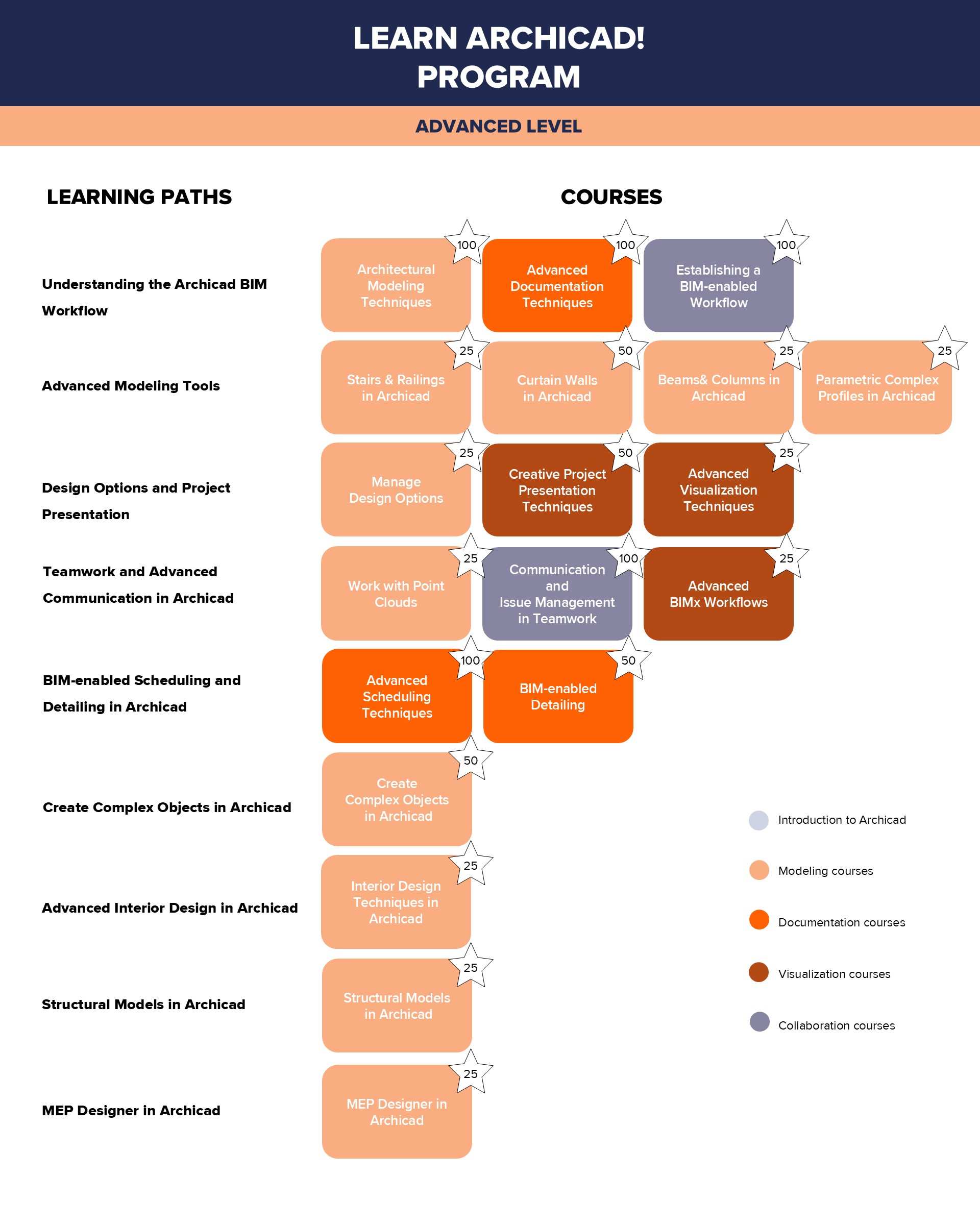 Once you purchase the Learn Archicad! subscription, you will instantly access all online courses, organized into the learning paths displayed below: