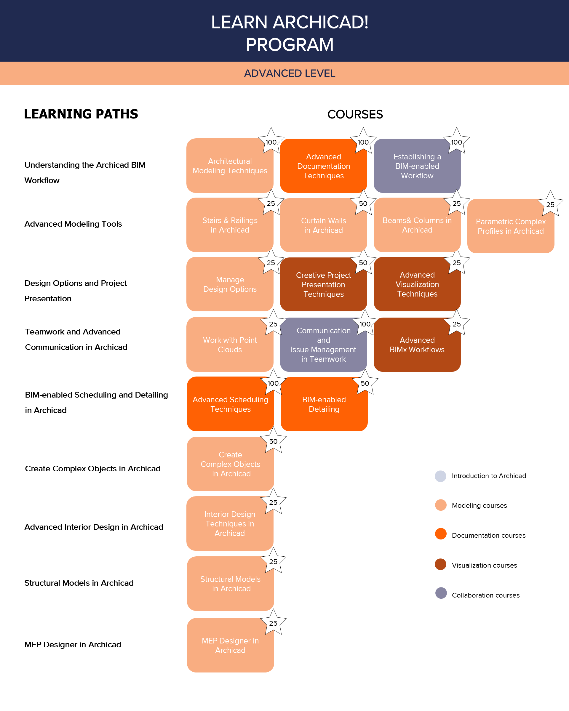 There are 2 levels of courses included in the Learn Archicad! Program. The foundation courses provide a strong fundamental understanding of Archicad and other Graphisoft products, earning you points towards becoming a Certified Archicad BIM User. Meanwhile, the advanced courses further enhance your knowledge and skills, guiding you towards the coveted title of Certified Archicad BIM Author.
