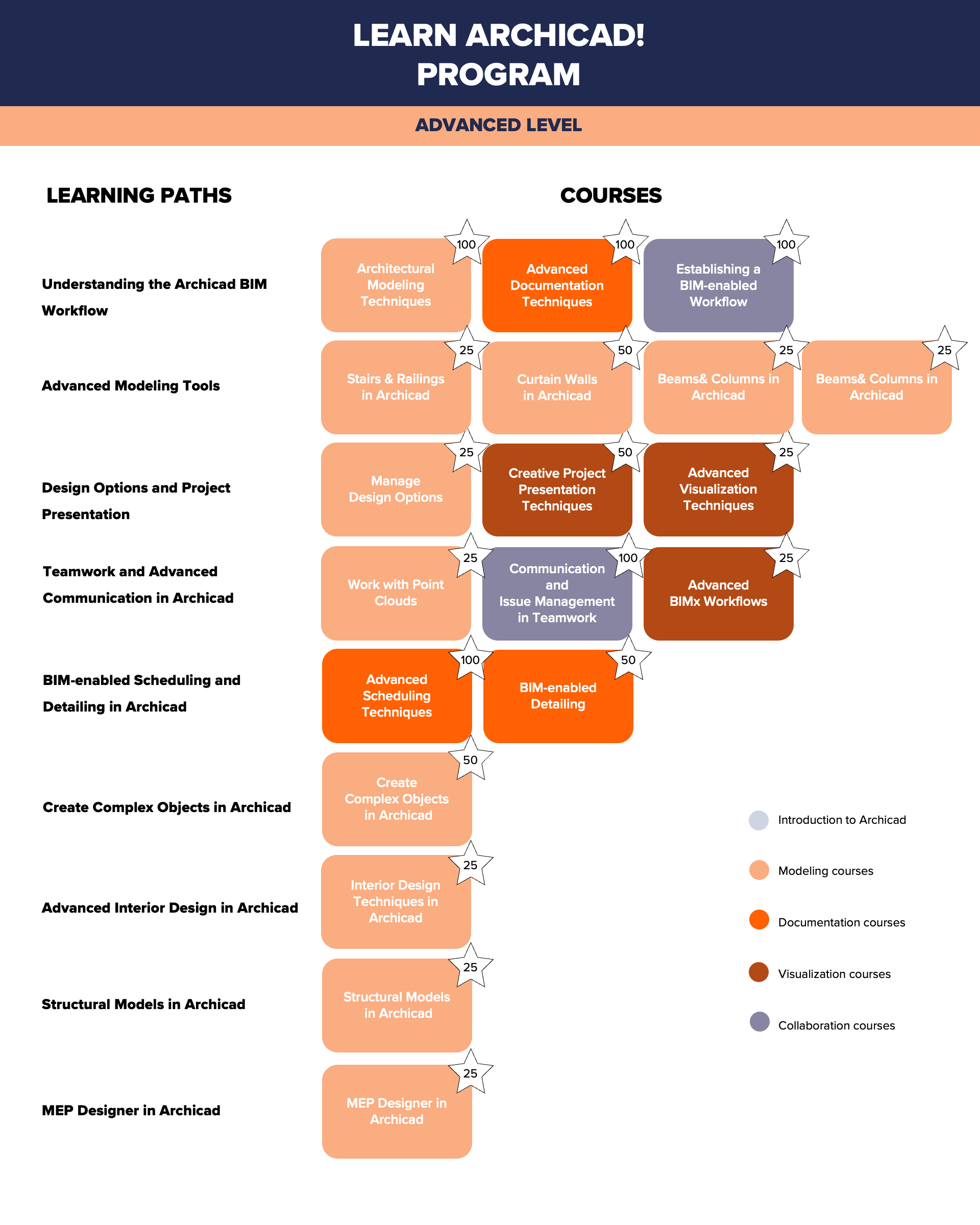 There are 2 levels of courses included in the Learn Archicad! program. The foundation courses provide a strong fundamental understanding of Archicad and other Graphisoft products, earning you points towards becoming a Certified Archicad BIM User. Meanwhile, the advanced courses further enhance your knowledge and skills, guiding you towards the coveted title of Certified Archicad BIM Author.